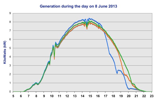 This chart shows how output varies with the seasons, as this is from a sunny day in December 2012, when 77 units were generated. This is just above the daily average (mean) of 74 units per day throughout the year. In the 12-month period up to May 2013, there were only 12 days when less than 5 units were generated. Overall, there were 133 days when output was under 50 units, 119 days with 50-100 units generated and 113 days with over 100 units.