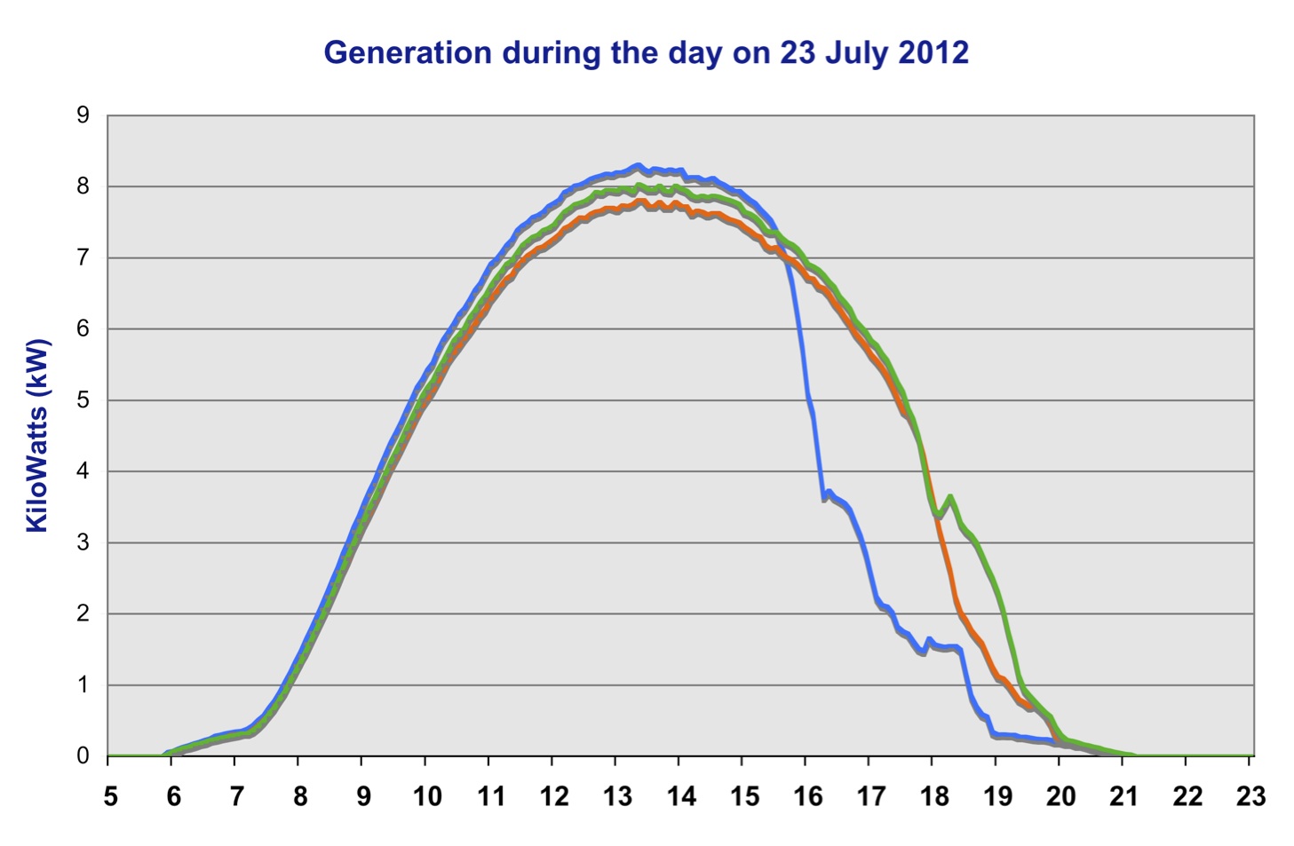 The chart below shows electricity generation on one of our best days so far in July 2012, when 191 units (kWh) were generated in a single day. The three lines show the power recorded through each of the three inverters, which are fed from three sets of panels on the roof. Generation started at about 6am and continued to 9pm (21:00).